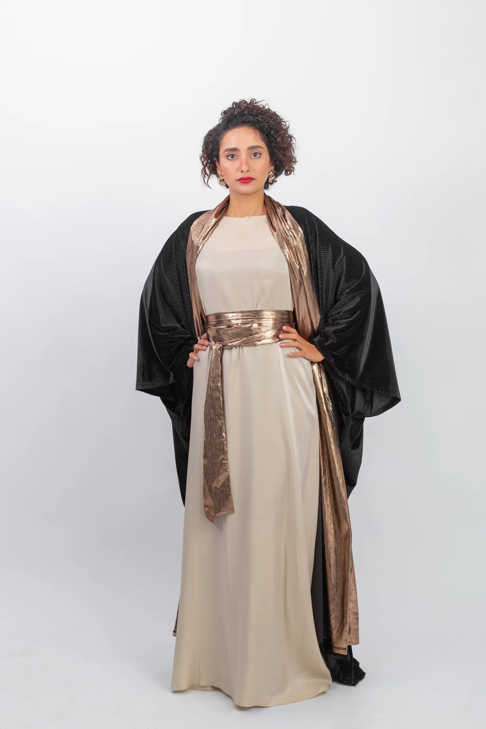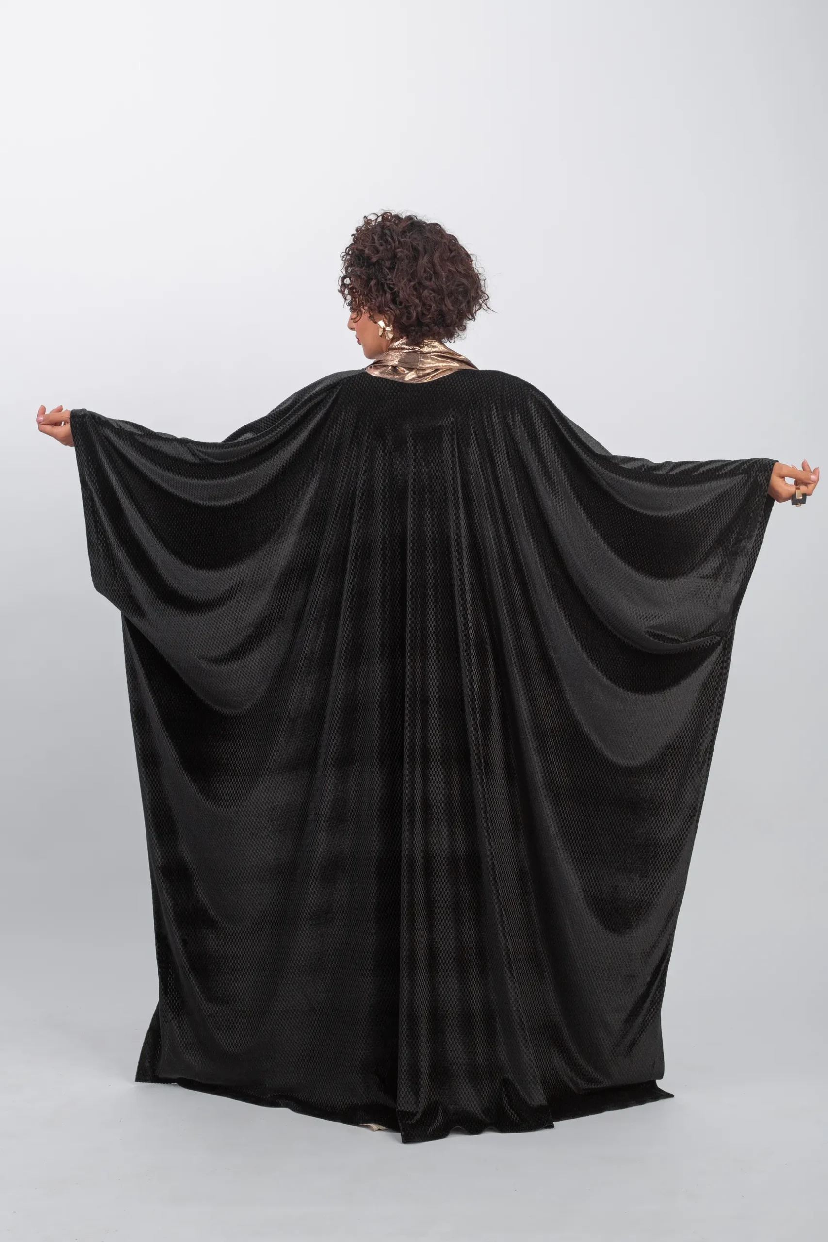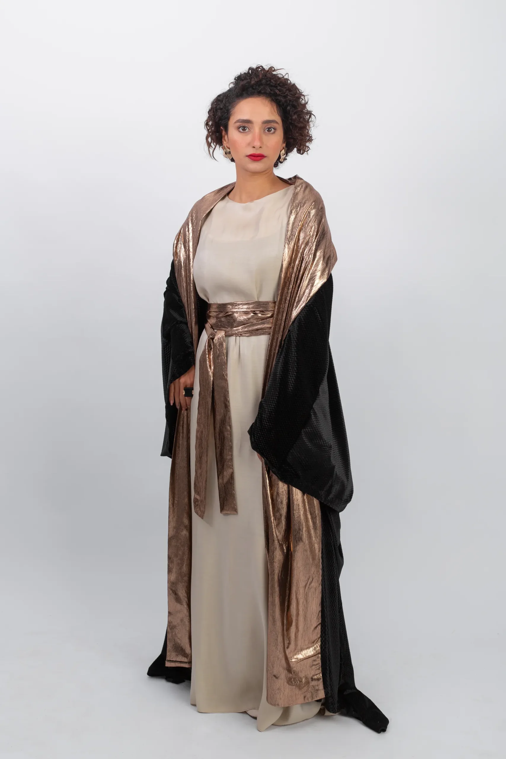 A living embodiment of royal luxury; this premium black velvet kaftan blends the warmth of the fabric with the brilliance of metallic bronze Lamé. Featuring a fluid, comfortable design with a wide waist belt to accentuate the silhouette, and an elegant upper wrap for a sophisticated presence at grand occasions. An exceptional piece from the BISHT collection for the woman seeking exclusivity.